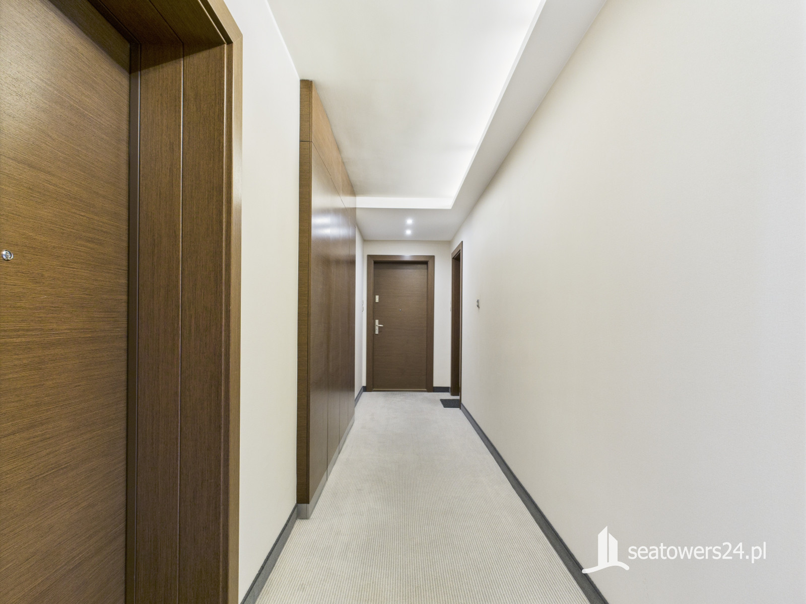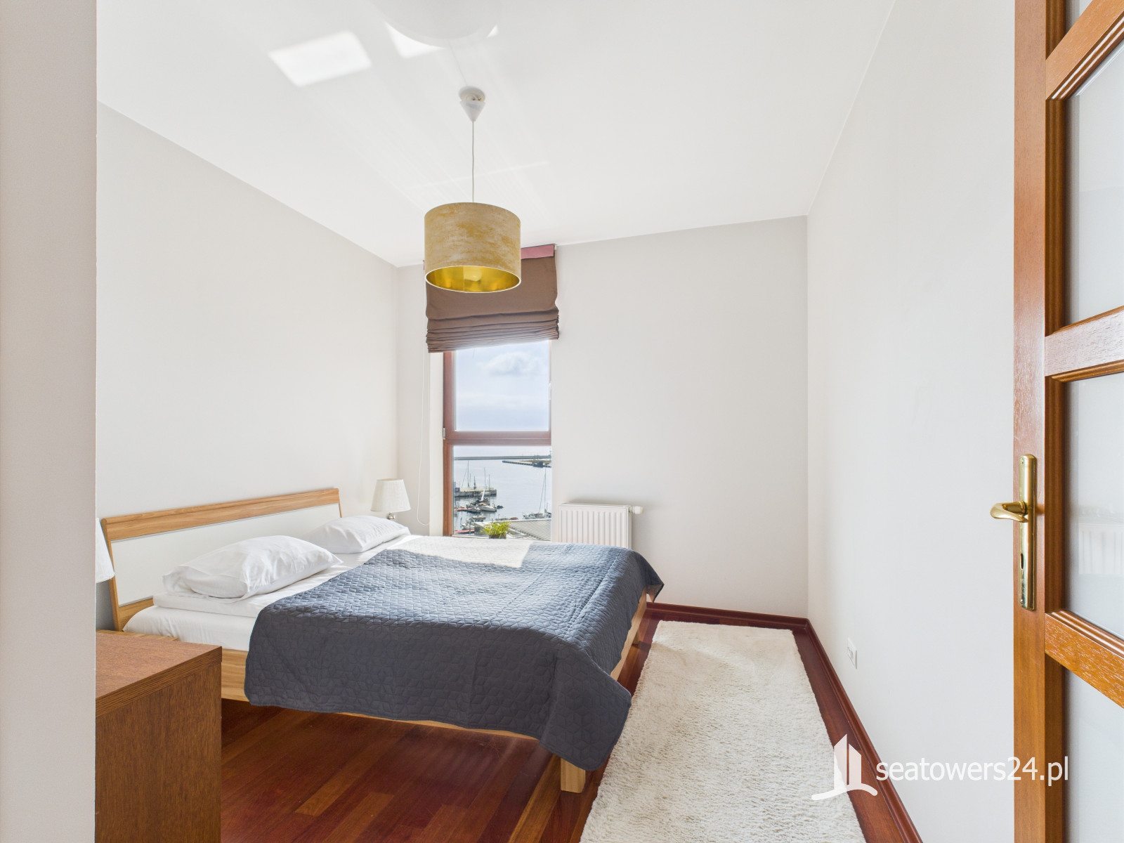 Apartament znajduje się na VIII kondygnacji kompleksu Sea Towers. Na jego metraż 80 m2 składa się pokój dzienny z aneksem kuchennym, sypialnia, pokój z sofą rozkładaną, dwie łazienki, przedpokój. Mieszkanie jest doskonale usytuowane w bryle budynku, otwierając się na widok zarówno miasta jak i pięknej Mariny. W apartamencie zamontowane zostały wyłącznie wysokie okna, które czynią wnętrze wyjątkowo słonecznym i doświetlonym, jednocześnie komplementując rozpościerające się wspaniałe widoki. Niezaprzeczalnym atutem jest również balkon, który wygląda na najbardziej pożądaną stronę Sea Towers. Przeszklony balkon, spogląda na Zatokę Gdańską z mariną jachtową w tle.