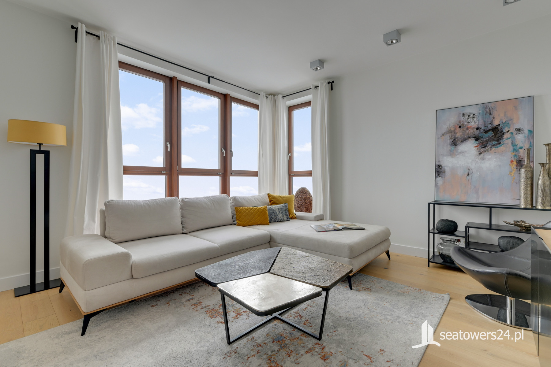 Trzypokojowy apartament w budynku Sea Towers zlokalizowany na XVIII kondygnacji z widokiem na miasto i port.