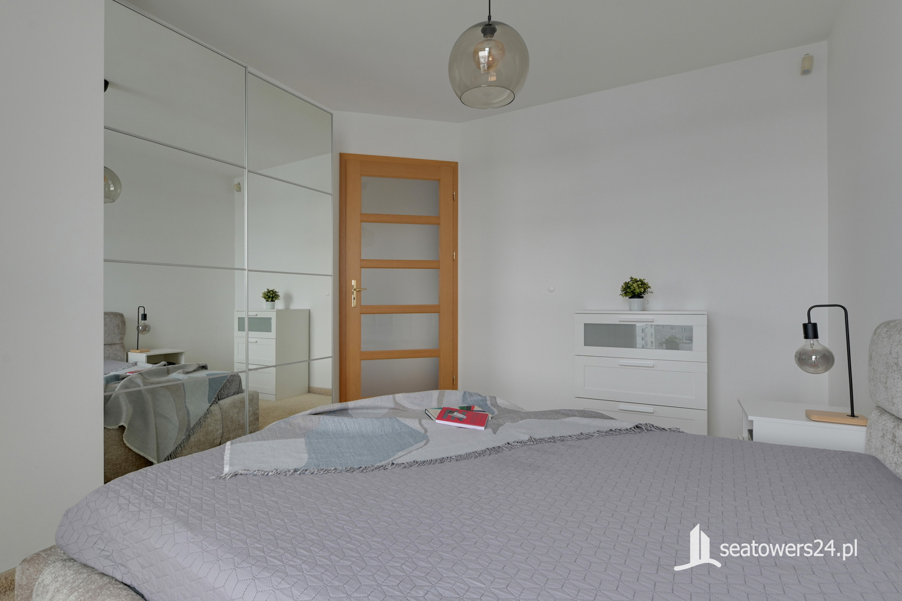 Apartament znajduje się na 6 piętrze (X kondygnacji), a swoją powierzchnią 49 m2 obejmuje: salon z aneksem kuchennym, sypialnię, łazienkę z toaletą oraz przedpokój. Mieszkanie zostało zaaranżowane w klasycznej kolorystyce bieli i jasnego drewna. Przestronny pokój dzienny łączy w sobie część rekreacyjną oraz jadalnianą. Chłodna kolorystyka mebli zjawiskowo kontrastuje z ciepłą tonacją drewnianej podłogi, a modernistyczne wyposażenie pozwala cieszyć się komfortem. Zadbany aneks kuchenny z pełną zabudową gwarantuje wszystkie niezbędne sprzęty AGD. W sypialni, tak jak w reszcie lokalu, postawiono na stonowaną kolorystykę. Modernistyczne, duże, małżeńskie łóżko i praktyczna zabudowa meblowa dominuje w pomieszczeniu. Łazienka oferuje kabinę prysznicową oraz toaletę.
