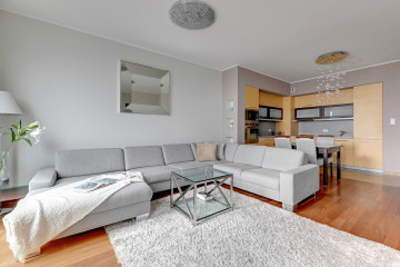 Przestronny, dwupokojowy apartament na 16 piętrze (XX kondygnacji) luksusowego apartamentowca Sea Towers, który składa się na salon z aneksem kuchennym, sypialnię, łazienkę i przedpokój. Apartament zaaranżowany w klasycznym, stonowanym kolorystycznie stylu będzie ostoją spokoju i doskonałym miejscem do relaksu dzięki rozpościerającym się, wspaniałym widokom na Gdańską Zatokę, port jachtowy, plażę i panoramę Gdyni. Salon wyposażono w dużą, szarą kanapę rogową w komplecie ze stolikiem kawowym oraz telewizorem. Przestronny aneks kuchenny połączono z jadalnią, oszczędzając przestrzeń w części dziennej. Kuchnię w odcieniu ecru i szarości w pełni wyposażono w sprzęt najwyższej jakości. Sypialnia w duchu klasycyzmu oferuje podwójne łóżko, telewizor oraz funkcjonalne biurko wstawione we wnękę. Łazienkę w ciepłej, kremowej kolorystyce stanowi wanna, kabina prysznicowa, umywalka i toaleta. Całość prezentuje się elegancko i spójnie.